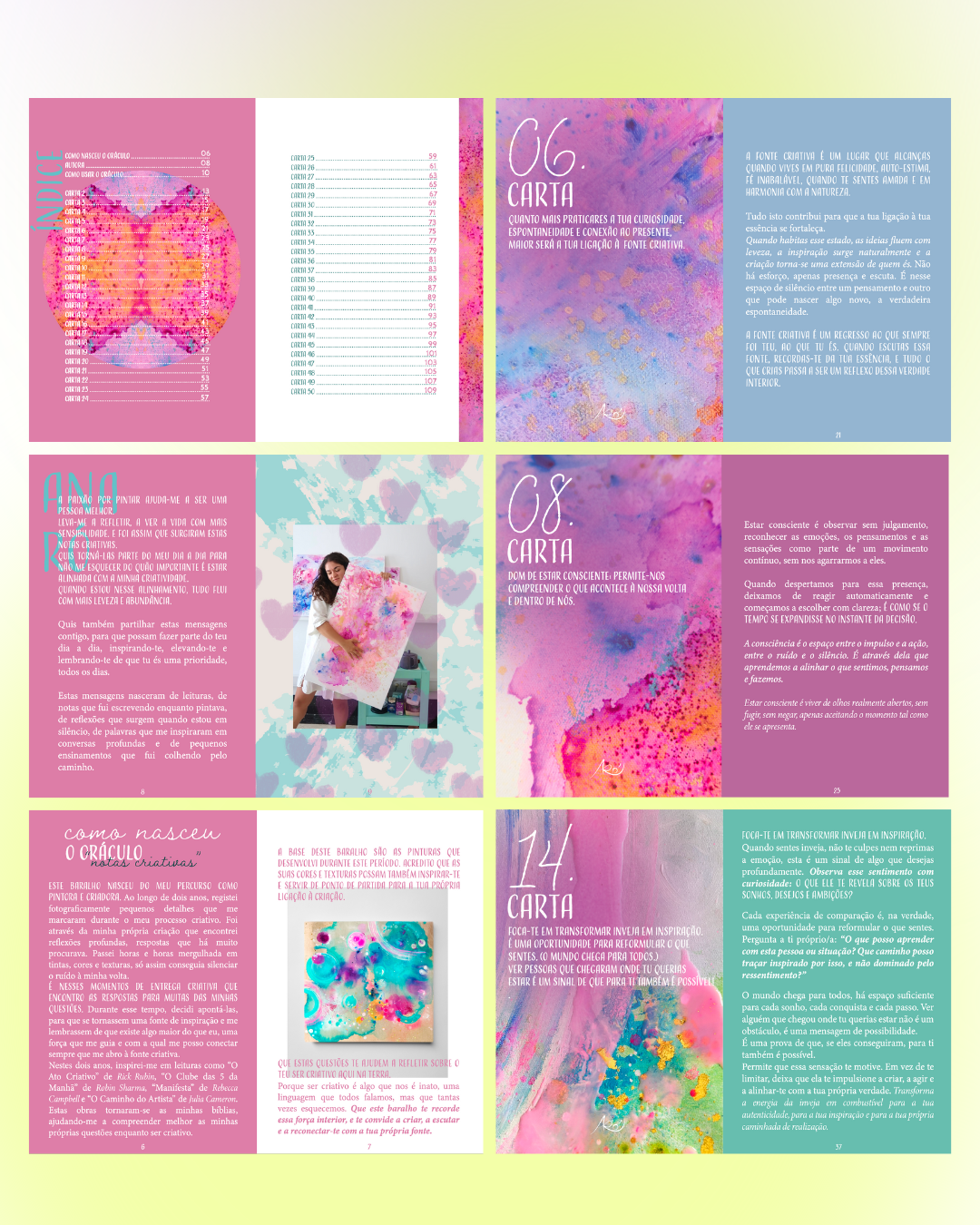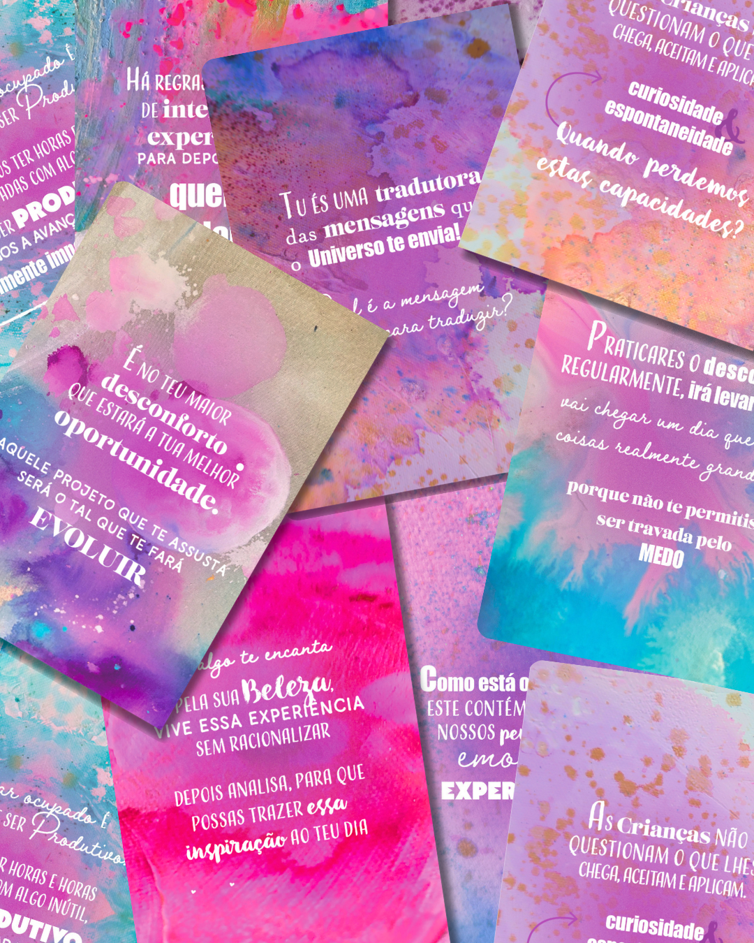 O Oráculo "Notas Criativas" nasceu da vontade de guardar os registos fotográficos dos detalhes de pinturas que fui fazendo — as cores, texturas e brilhos que tanto me inspiram. Assim, poderiam passar a ser memórias vivas de cada processo criativo, do qual tenho vindo a decifrar metáforas para a vida.